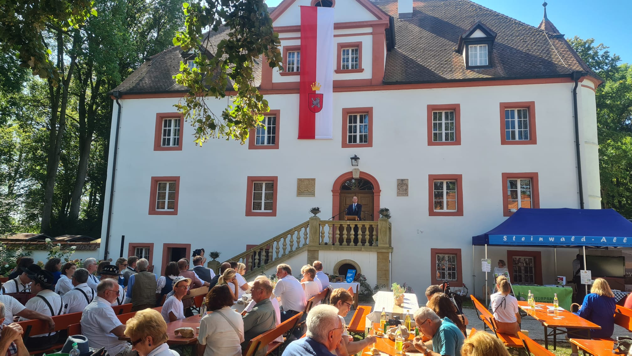 Viele Ehrengäste fanden sich zur Feier des Tages zur Bio-Meile-Eröffnungsrunde mit ein, darunter auch Staatsminister Albert Füracker, der von den Kastler Böllerschützen gebührend begrüßt wurde. Neben der Besichtigung der symbolischen Vorausschau auf den geplanten Erntedankzug 2025 vor den Schlosstoren mit einer Ausstellung alter Erntemaschinen und historischer landwirtschaftlicher Tätigkeiten und der Vorstellung aller ausstellenden Bio-Betriebe deutete der Minister in seiner Rede auch auf die Wichtigkeit der heimischen Öko-Landwirtschaft hin.