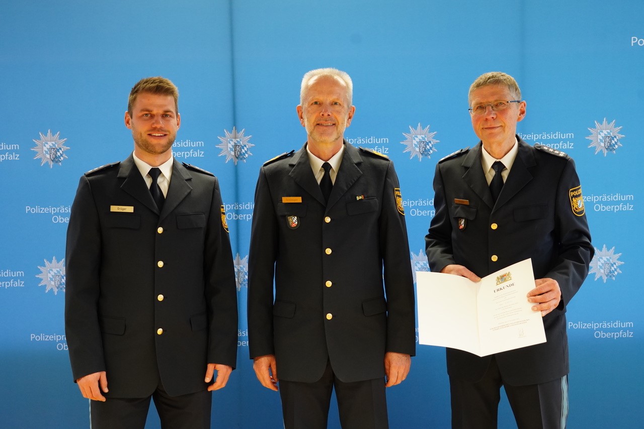 REGENSBURG. Polizeipräsident Thomas Schöniger verabschiedete am Montag, den 30. Dezember 2024, den bisherigen Dienststellenleiter der Zentralen Ergänzungsdienste Regensburg, Ersten Polizeihauptkommissar Albert Schäffer, in den wohlverdienten Ruhestand. Gleichzeitig wurde Polizeihauptkommissar Matthias Gröger als neuer Leiter in sein Amt eingeführt.