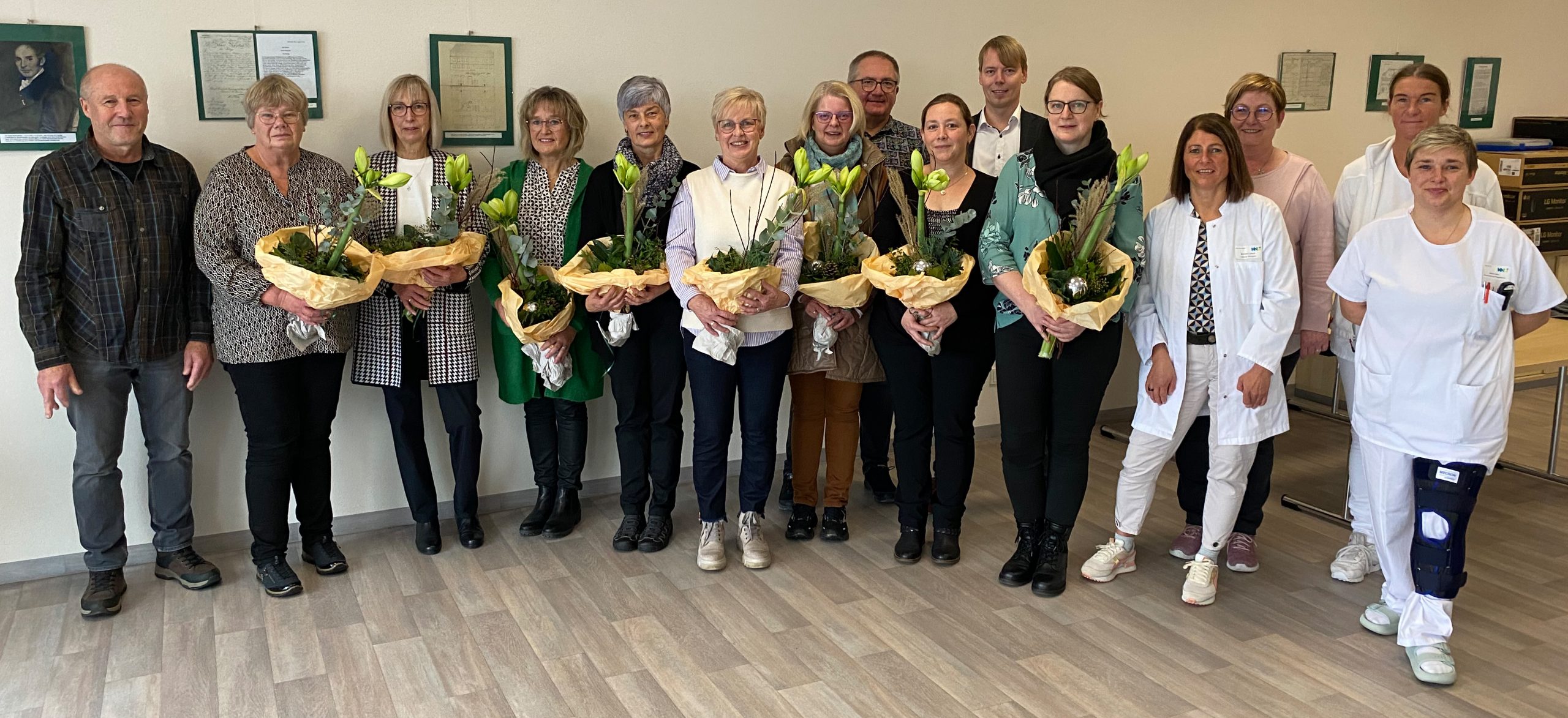 Die Geehrten erhielten nicht nur einen Blumenstrauß und eine kleine Aufmerksamkeit, sondern auch einen kurzen Überblick über ihre jahrelange Tätigkeit im Krankenhaus. Stephan Schumacher und Renate Lindgens würdigten die täglichen Beiträge zum Wohl der Patientinnen und Patienten und betonten, dass die Geehrten wichtige Stützen für die Teams und das gesamte Haus waren und sind.