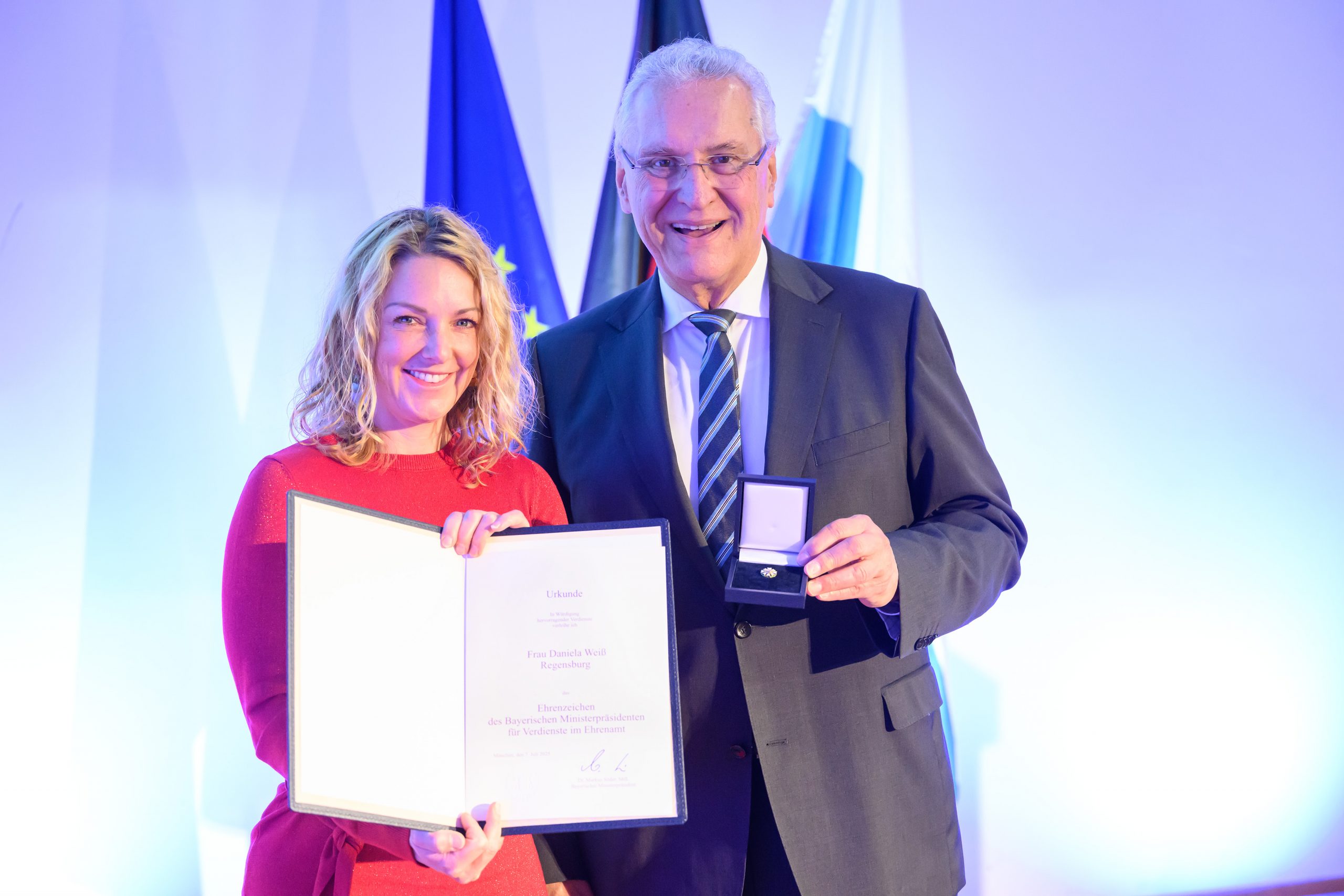 REGENSBURG. Bayerns Innenminister Joachim Herrmann hat in Nürnberg das Ehrenzeichen des Bayerischen Ministerpräsidenten für Verdienste im Ehrenamt an 60 Personen aus ganz Bayern verliehen. Zwei der Geehrten stammen aus Regensburg: Daniela Weiß und Reinhard Schöftenhuber.
