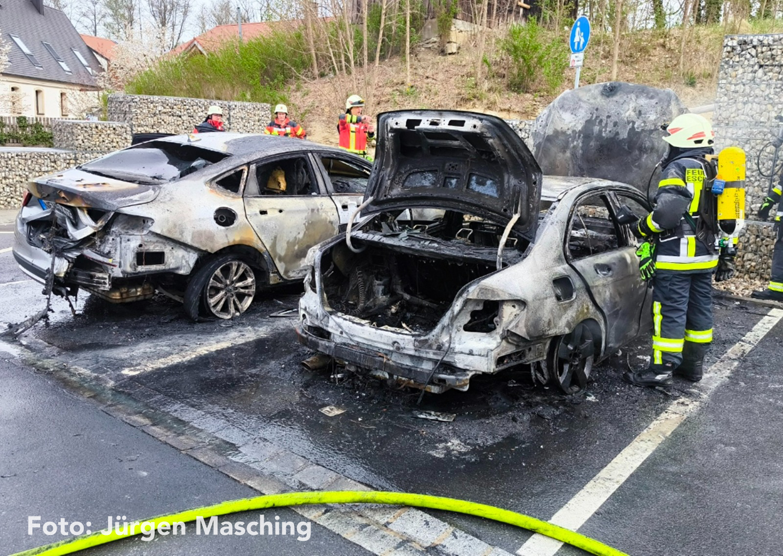 Binnen kurzer Zeit breitete sich das Feuer auf das gesamte Fahrzeug aus. Noch vor dem Eintreffen der alarmierten Einsatzkräfte griffen die Flammen zudem auf ein benachbart geparktes Auto über. Die Feuerwehr Eschenbach i.d.OPf. konnte den Brand schnell unter Kontrolle bringen – beide Fahrzeuge waren jedoch nicht mehr zu retten und mussten abgeschleppt werden.