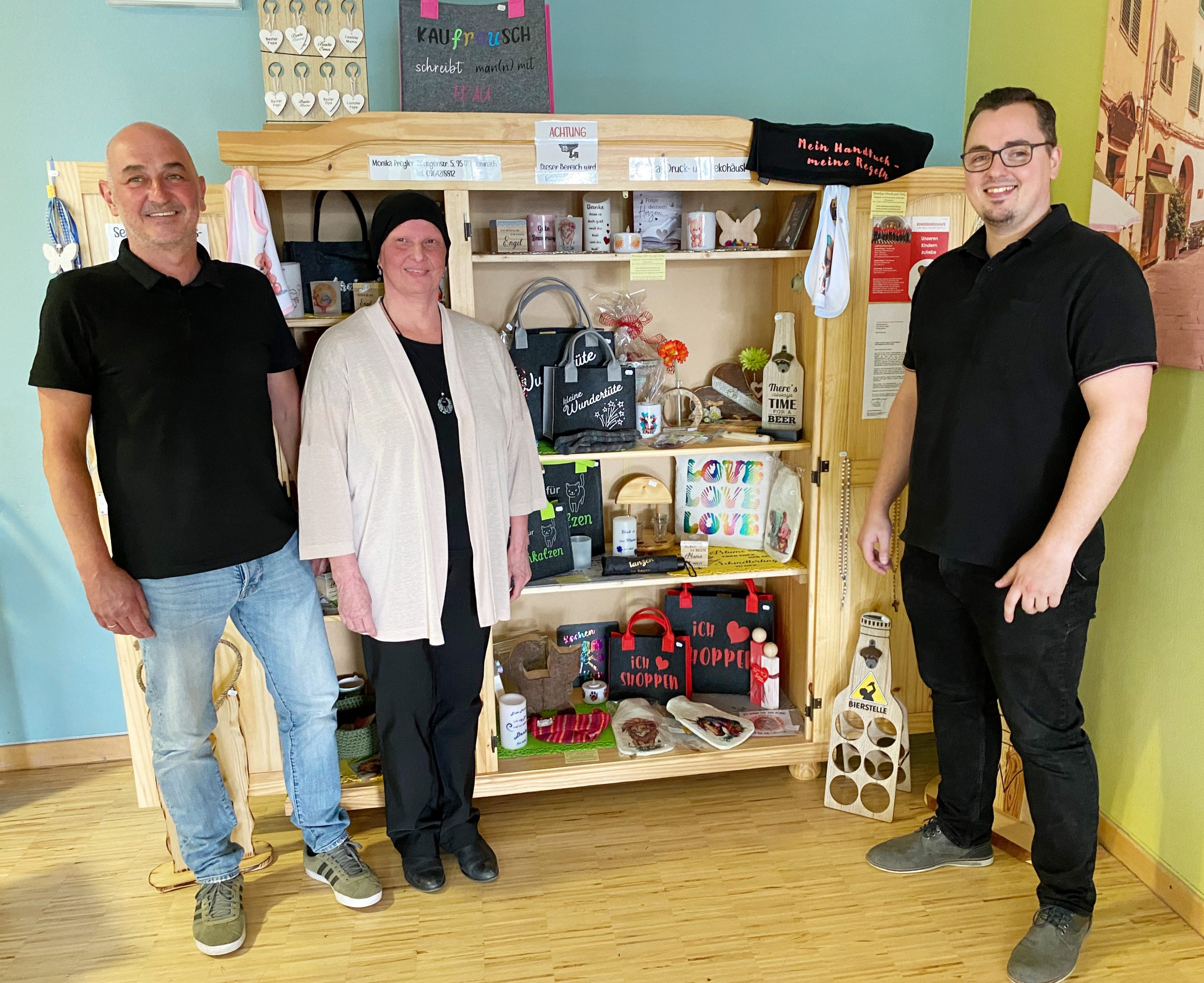 KEMNATH. Von Tassen über Kerzen, Handtaschen oder Wärmflaschen bis hin zu individuellen Biertragerln – all das fertigt Monika Pregler aus Kemnath mit vielen fleißigen Helfern in ihrer Freizeit an. Die Erlöse daraus kommen der Kinderkrebshilfe zugute. Und auch am Krankenhaus Kemnath steht jetzt ein solches „Dekohäusl“ beziehungsweise ein „Dekoschrank“.