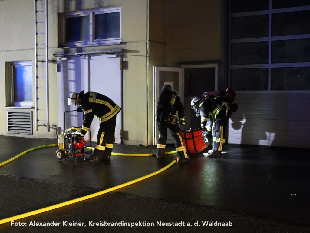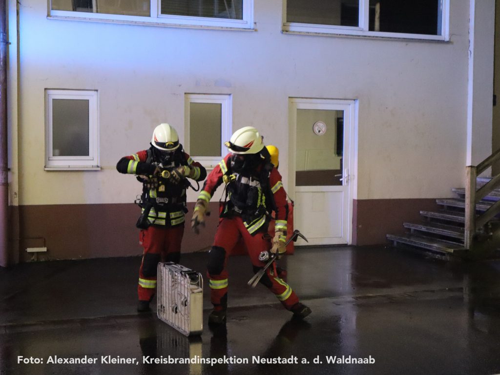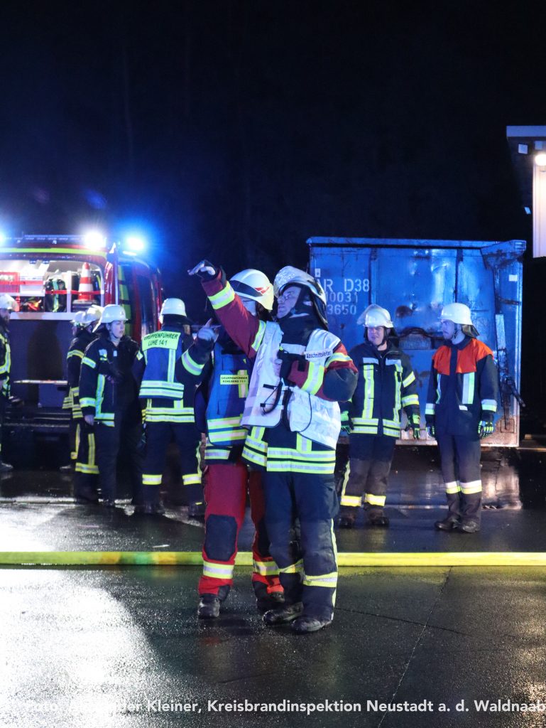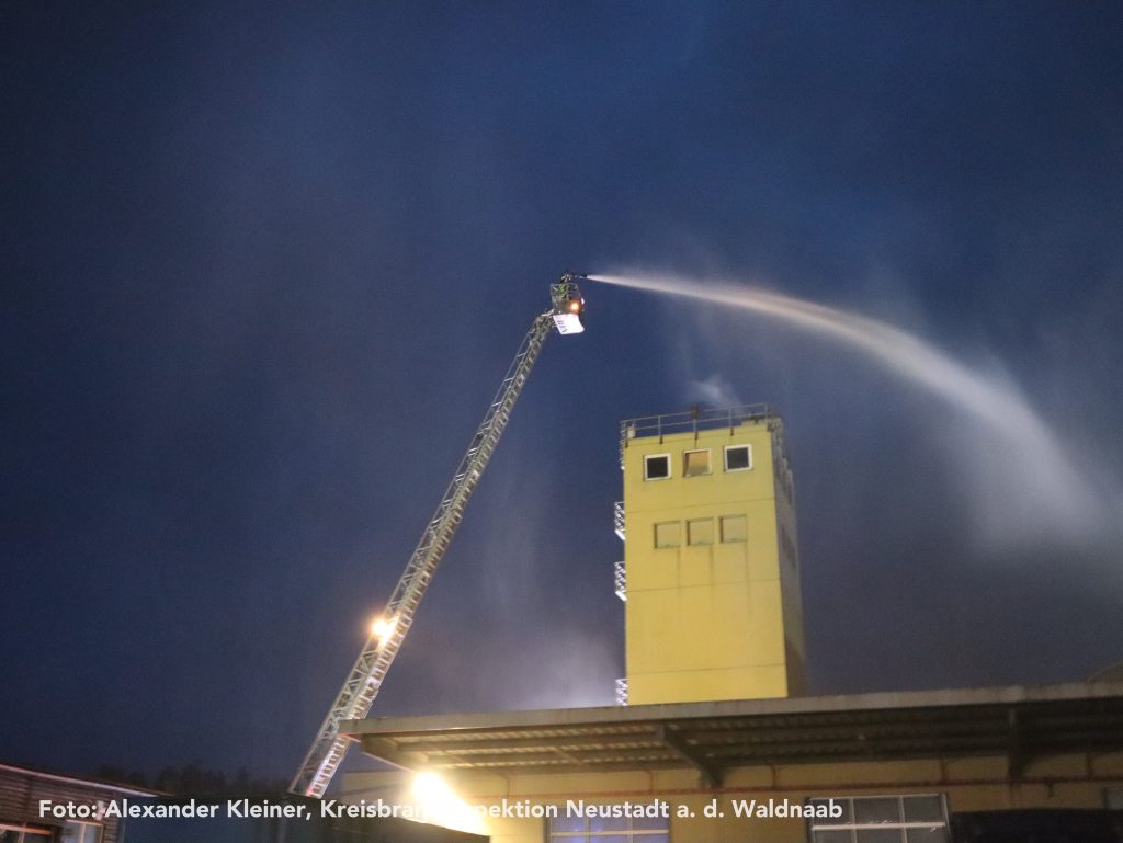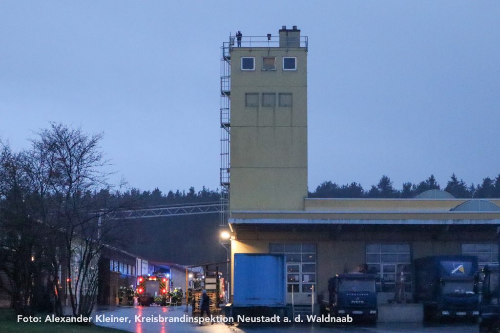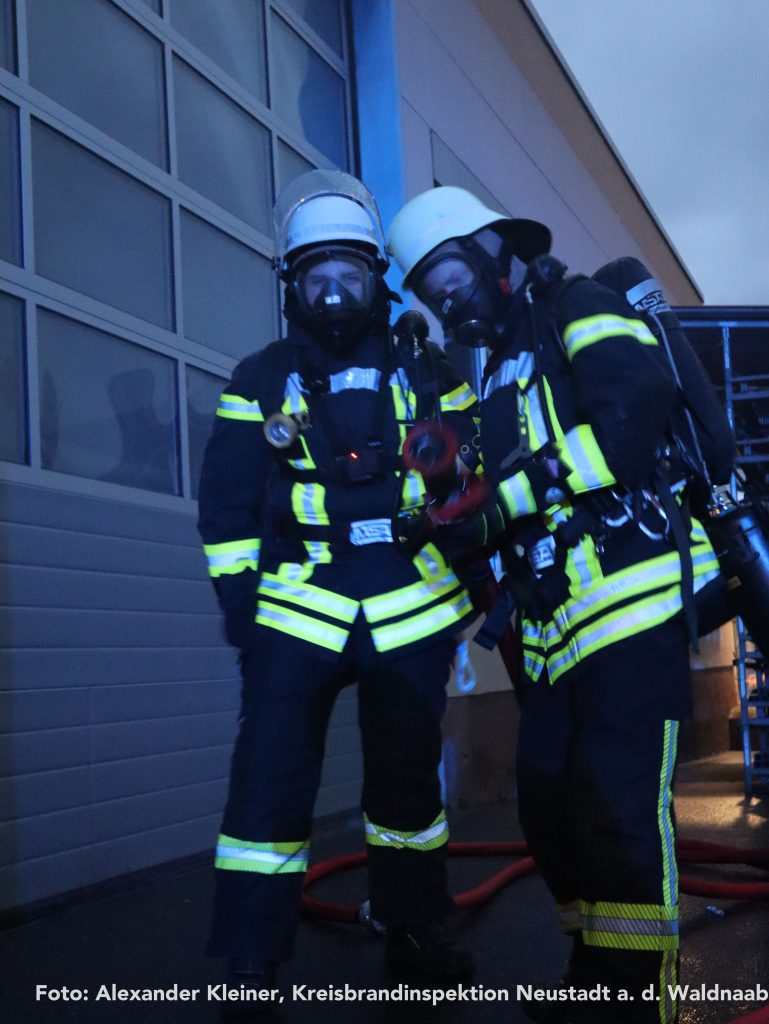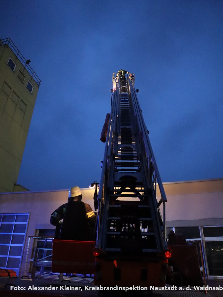 Eine vermisste Person machte sich währenddessen auf einem Turm der Produktionsanlage bemerkbar. Mithilfe der Drehleiter der Feuerwehr Weiden konnte die Rettung zügig und sicher durchgeführt werden. Auch die übrigen Vermissten wurden nach intensiver Suche aus den Hallen gerettet und ins Freie gebracht – für die eingesetzten Atemschutzgeräteträger eine körperlich äußerst anspruchsvolle Aufgabe.