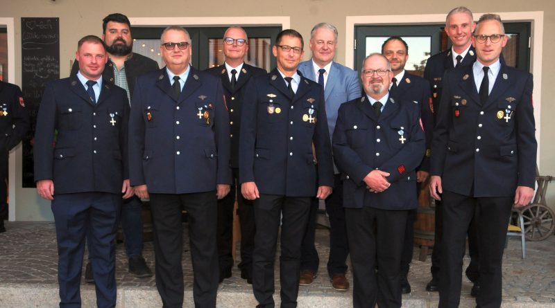 Auch die Feuerwehr Großalbershof war vertreten: Tobias Falk, Vorstand der Wehr, erhielt das Silberne Ehrenzeichen. Ihm gratulierte sein Stellvertreter, 2. Kommandant Michael Gebhard.