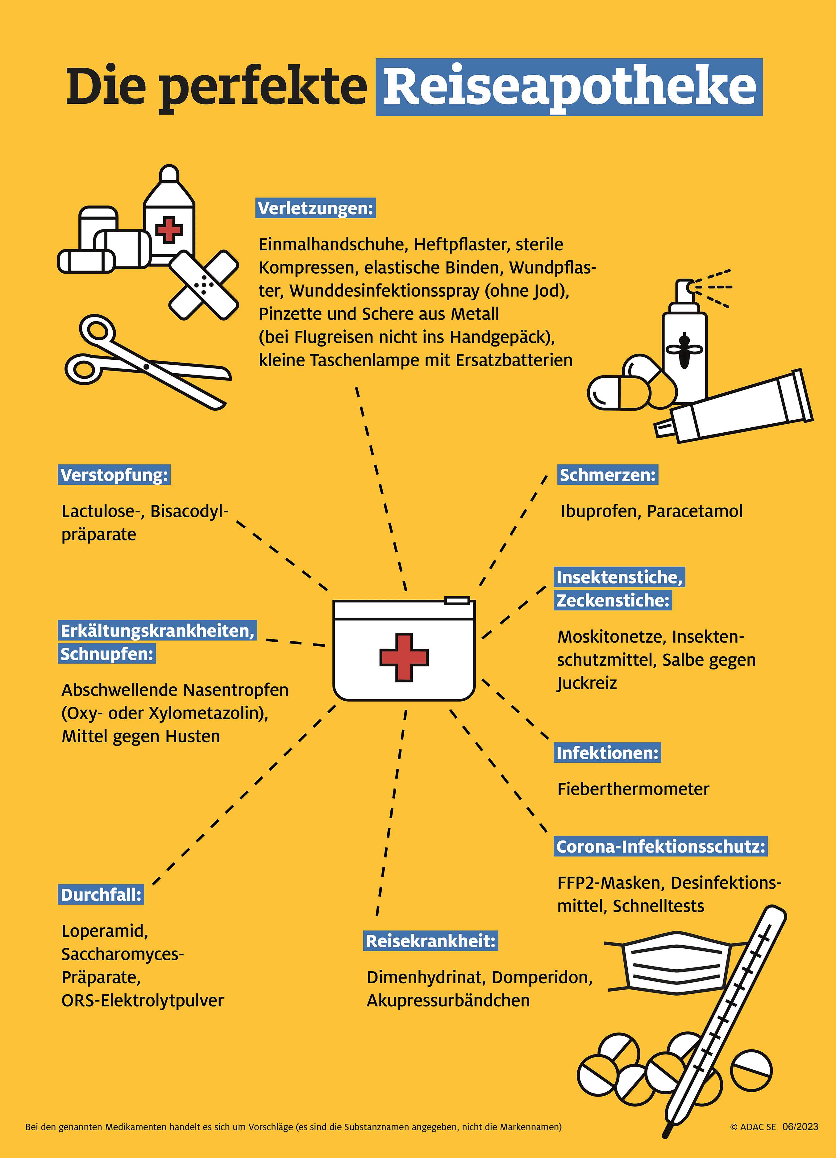 Bei den genannten Medikamenten handelt es sich um Vorschläge (es sind die Wirkstoffnamen angegeben, nicht die Markennamen). Steril verpackte Reiseapotheken sind auch in Apotheken erhältlich.