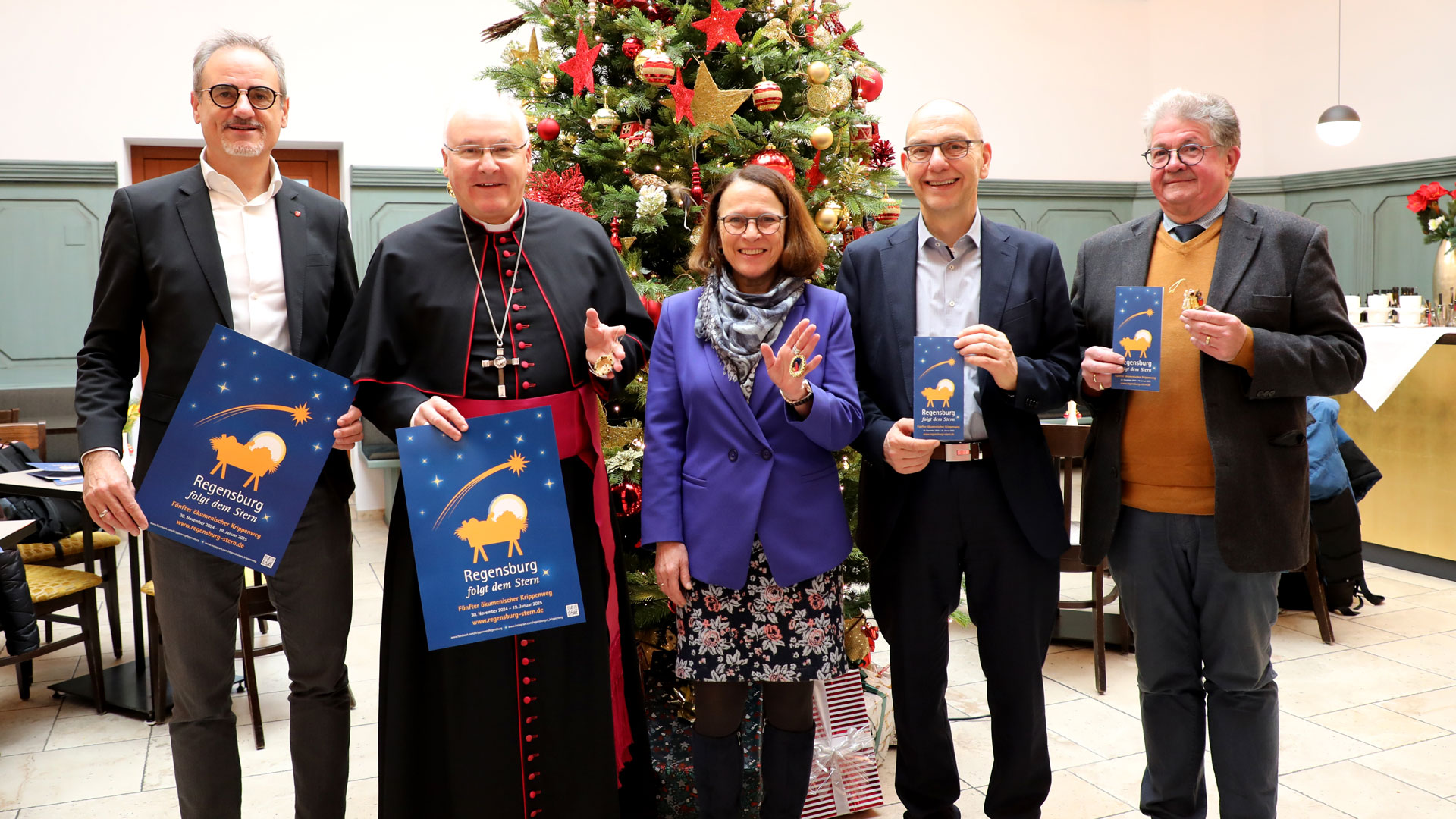 Kulturrefernt Wolfgang Dersch, Bischof Rudolf Voderholzer, Oberbürgermeisterin Gertrud Maltz-Schwarzfischer, Michael Quast vom Stadtmarketing Regensburg sowie Franz Glas vom Regensburger Krippenverein..