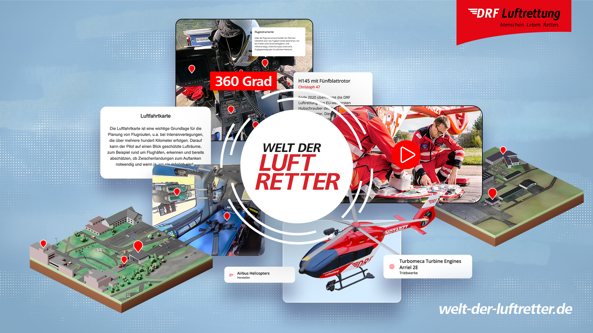 WEIDEN/FILDERSTADT. Die Welt der Luftretter ist ein digitaler Raum, der die DRF Luftrettung repräsentiert und erlebbar macht. Darin können alle 31 Stationen und deren unmittelbare Umgebung sowie Hubschraubermodelle und Learjet in einem 3D-Modell eigenständig erkundet werden. Einen realen Einblick vor Ort bieten mehrere 360-Grad-Aufnahmen. User können sich damit durch Hangar, Büro, Außenbereich und Hubschrauber bzw. Learjet bewegen. Dabei werden den Besuchern über gesetzte Info-Pins Informationen rund um die Luftrettung und Wissen vermittelt. Zudem präsentiert sich jede Station mit einem Videoportrait, das nicht nur Einblicke in die tägliche Arbeit, das Einsatzgebiet und die Besonderheiten vor Ort gibt, sondern vielmehr die gelebte Gemeinschaft und den Teamgedanken in den Fokus rückt.