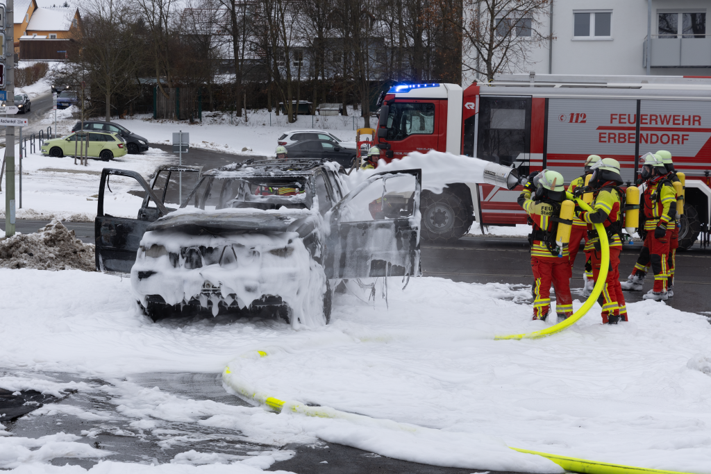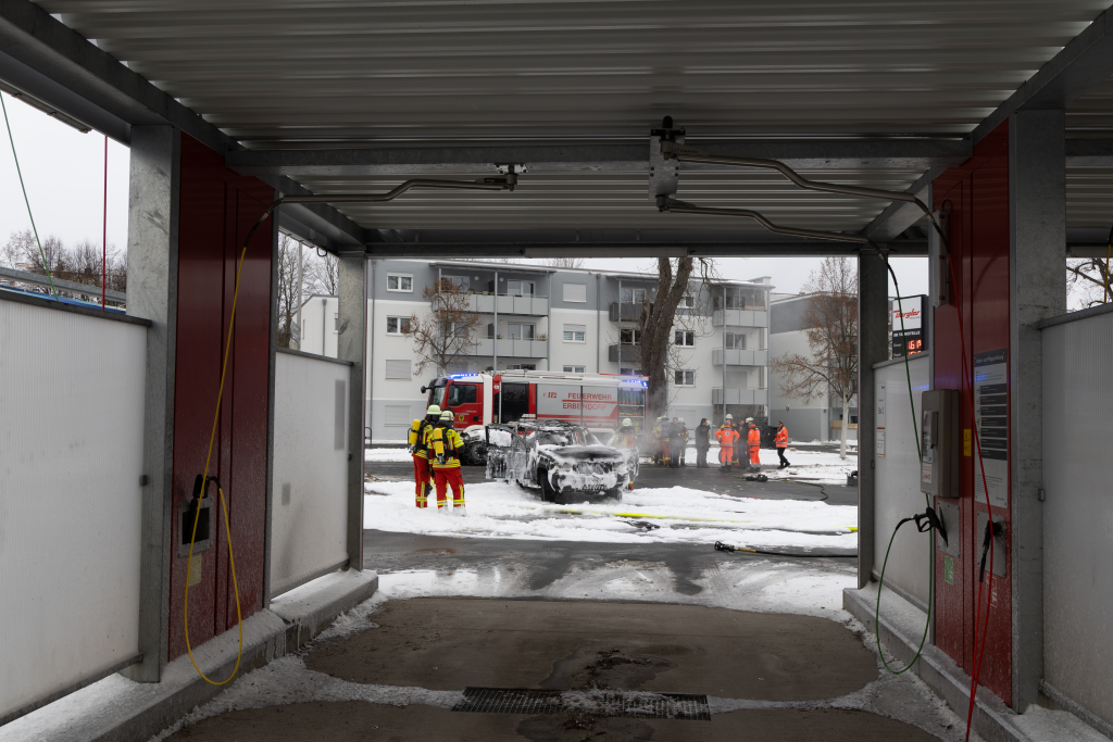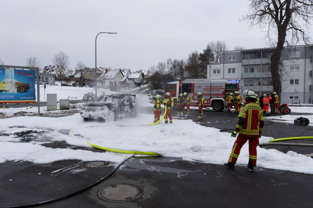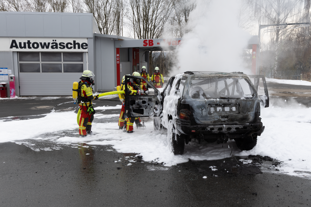 Bei Eintreffen stand der Pkw mit NEW- Zulassung bereits vollständig in Flammen. Nach ersten Informationen war der Gastank bereits geborsten, sodass keine akute weitere Gefahr bestand. Dennoch gingen die Einsatzkräfte unter schwerem Atemschutz mit besonderer Vorsicht vor.