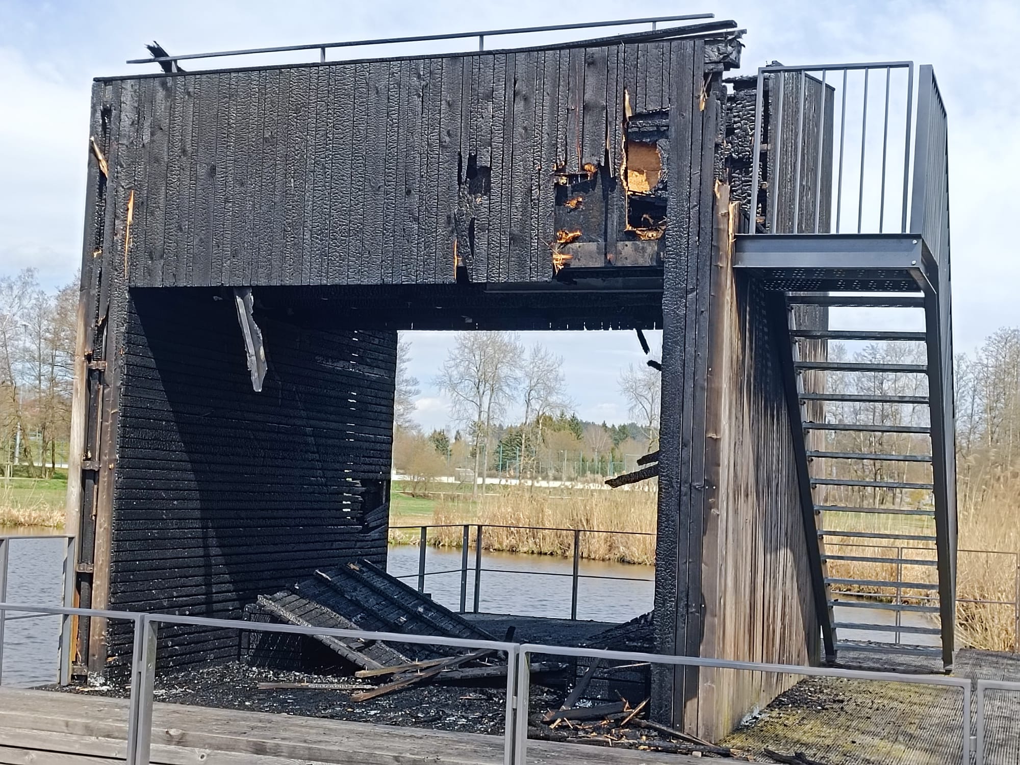 Wie bereits berichtet, wurde der vollständig aus Holz gebaute Aussichtspunkt, der sich dem Thema „Storch“ widmet, am Freitagabend, 4. April, ein Raub der Flammen. Der Sachschaden wird mittlerweile auf eine hohe sechsstellige Summe geschätzt.