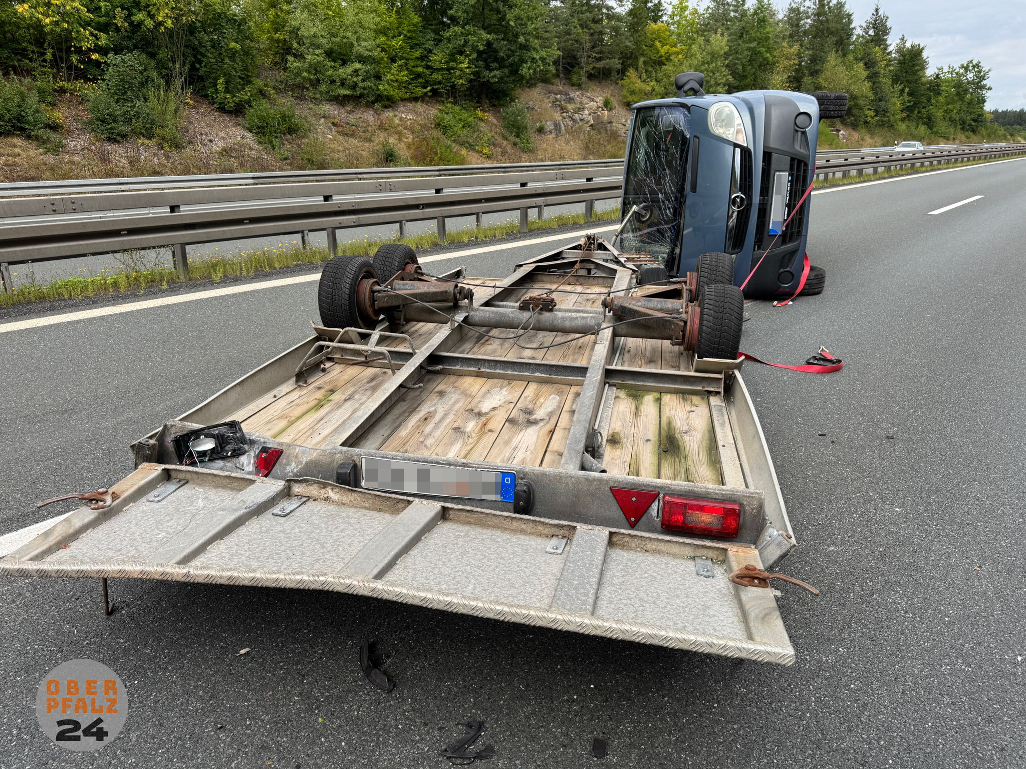 Der Vito mit insgesamt sieben Insassen geriet ins Schleudern. Der Anhänger, auf dem ein Kleintransporter verladen war, riss ab, überschlug sich und kam kopfüber auf der Fahrbahn zum Stillstand. Auch der beladene Transporter kippte um. Beide Fahrzeuge prallten mehrfach gegen die Leitplanken.