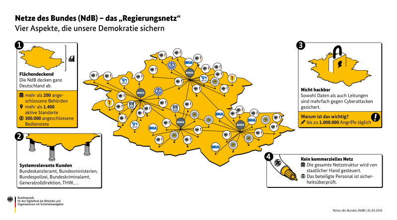 Die „Netze des Bundes“ sind ein gemeinsames Kommunikationsnetzwerk der Bundesregierung und öffentlichen Verwaltung. Sie verbinden Bundesministerien, Behörden und Einrichtungen miteinander und ermöglichen den Austausch von Daten, Sprache und Video in einem geschützten digitalen Raum. Rund 220 Bundesbehörden und Übergänge zu Netzwerken auf Länder‑ und Kommunalebene sind daran angeschlossen, über 300.000 Anwender nutzen diese Infrastruktur.