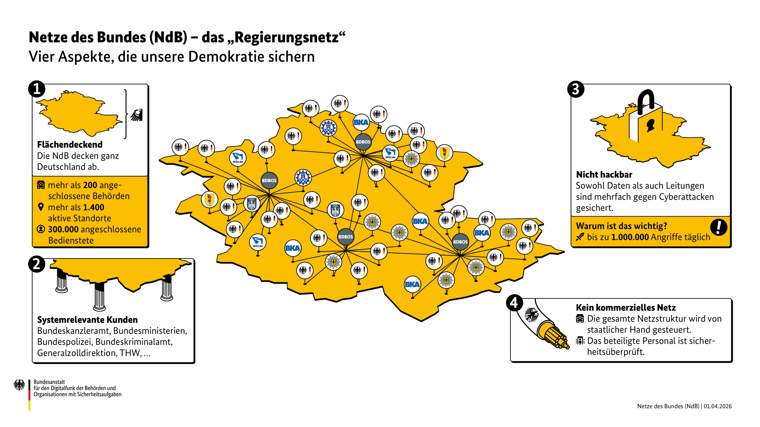 Betreiberin dieser kritischen Netze ist die Bundesanstalt für den Digitalfunk der Behörden und Organisationen mit Sicherheitsaufgaben (BDBOS). Diese Bundesbehörde mit Sitz in Berlin gehört organisatorisch zum Bundesministerium des Innern und hat seit 2019 den Netzbetrieb für die Netze des Bundes übernommen. Ursprünglich für den deutschlandweiten Digitalfunk für BOS‑Organisationen zuständig, wurde ihr Aufgabenfeld erweitert, um auch die gesicherte Kommunikation der Bundesregierung und Bundesverwaltung zu gewährleisten.
