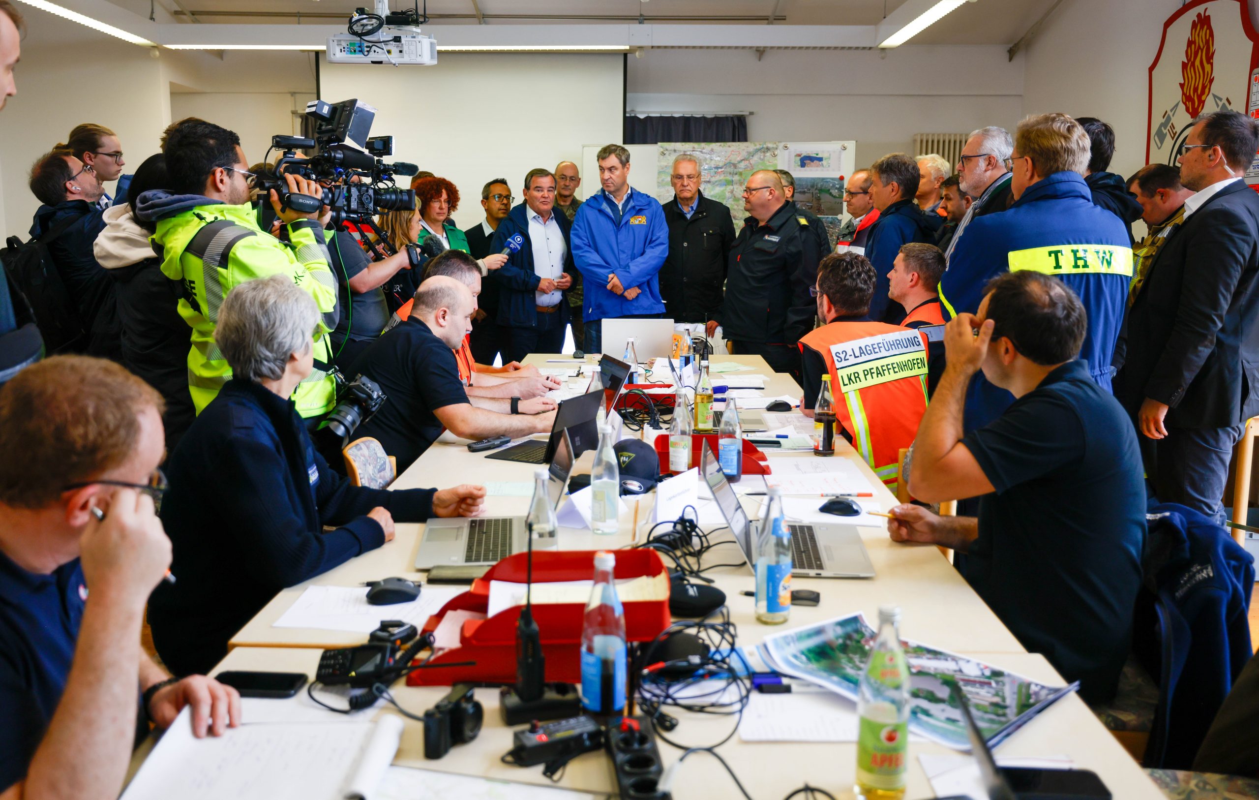 Ministerpräsident Söder, Innenminister Herrmann und Bundeswirtschaftsminister Habeck informieren sich über Hochwasserlage