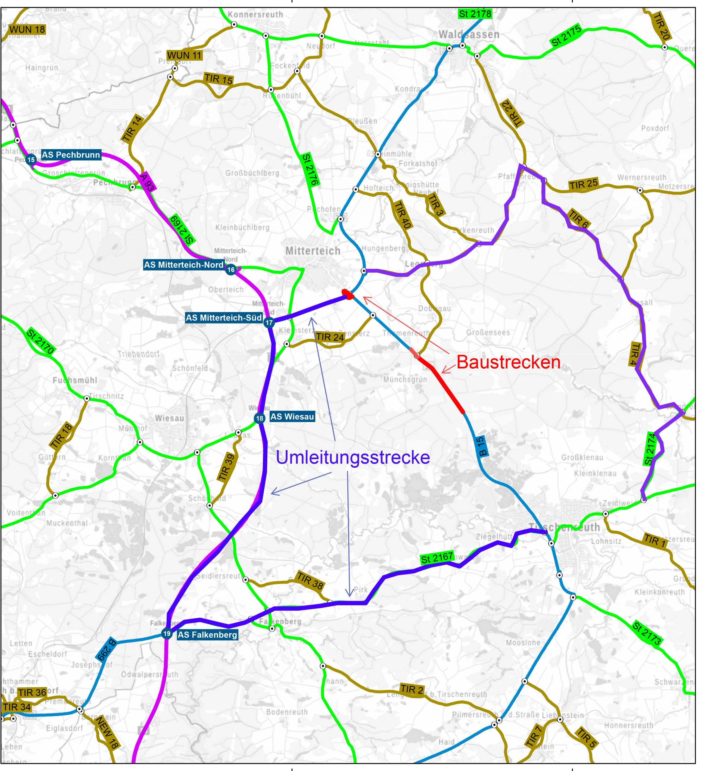 Die Umleitung ist ausgeschildert und verläuft ab der Einmündung der Staatsstraße 2167 in die B 15 am Kreisverkehr in Tirschenreuth, über die Staatsstraße 2167 über Falkenberg und dann zur Bundesautobahn A 93. In Richtung Mähring wird der Verkehr über die Kreisstraßen TIR 22,TIR 25, TIR 6 und TIR 4 (Wonderb) sowie die Staatsstraße 2174 geleitet. Das Staatliche Bauamt Amberg-Sulzbach empfiehlt allen ortskundigen Verkehrsteilnehmern diesen Bereich zu meiden und bittet wegen der Beeinträchtigungen des Verkehrs um Verständnis. Im Zuge der Arbeiten wird im Bereich von Themenreuth die Fahrbahndecke der Bundesstraße 15 auf einer Länge von ca. 2,1 km erneuert. Um die Sperrung auszunutzen werden darüber hinaus am Kreisverkehr bei Mitterteich die Kreisfahrbahn sowie die Rampen erneuert. Die Länge beträgt hier knapp 1 km. Die Kosten der Gesamtmaßnahme belaufen sich insgesamt auf rd. 900.000 Euro.