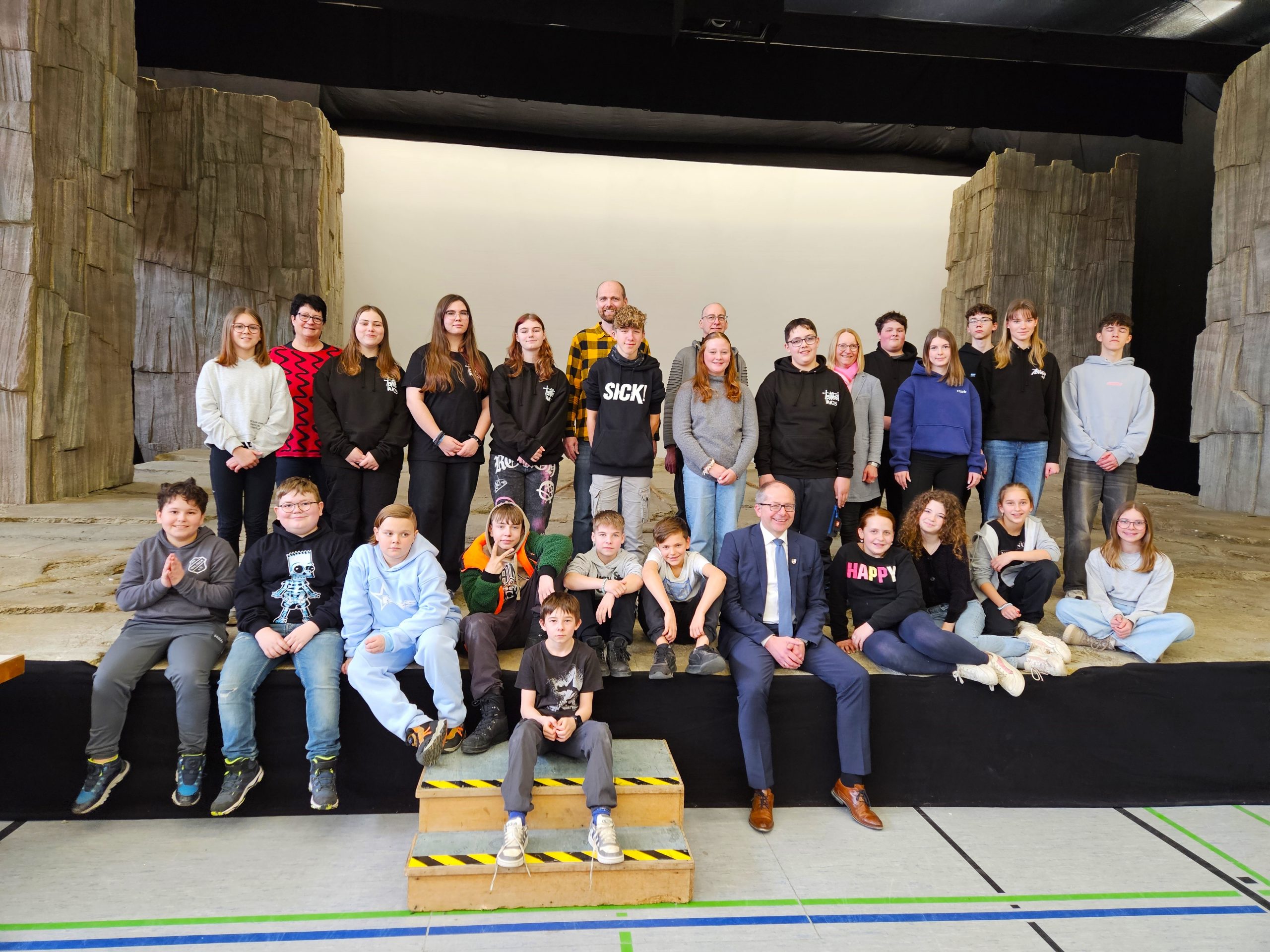 Maximilian Ponader mit den Realschülern auf der Bühne (vorne)