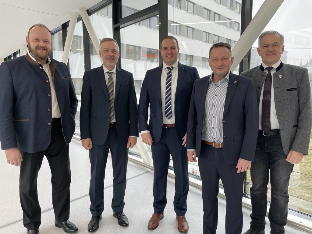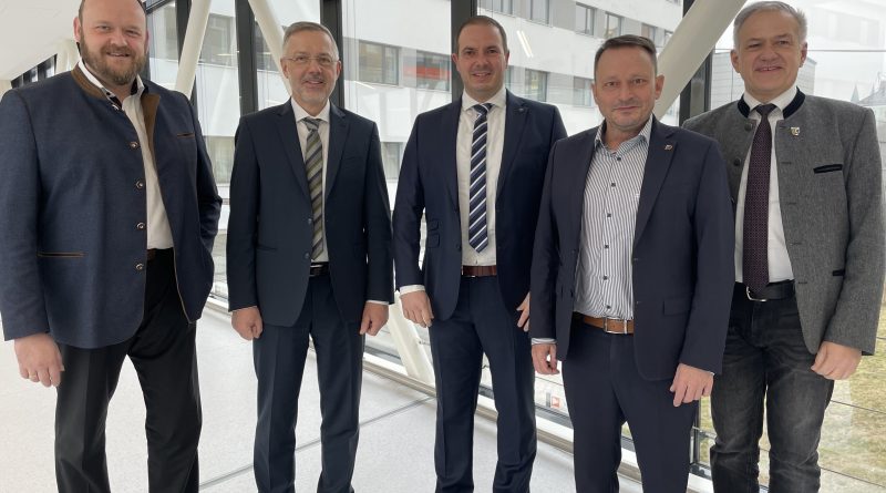Vorstand Michael Hoffmann und sein Nachfolger Ralph Junghans (Zweiter und Dritter von links) organisieren einen geordneten Übergang in der Führung der Kliniken Nordoberpfalz AG. Unterstützt werden sie von Landrat Andreas Meier (links) sowie Landrat Roland Grillmeier und Oberbürgermeister Jens Meyer (von rechts).