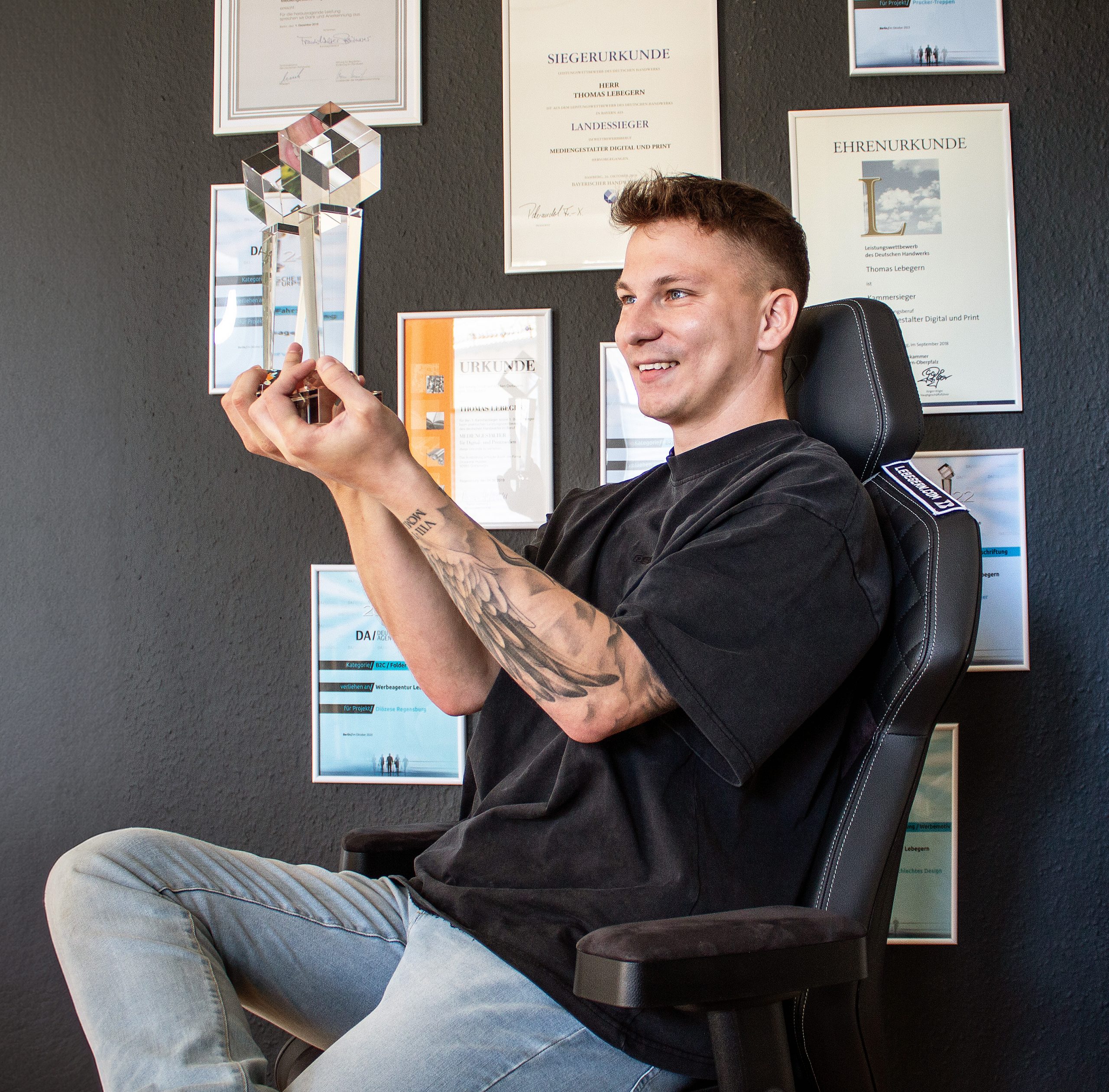 Kammer-, Landes- und Bundessieger 2018 der Deutschen Handwerkskammer zum Abschluss seiner 2015 begonnenen Ausbildung als Mediengestalter Digital und Print, während dieser Zeit in einer Werbeagentur bereits der erste Platz beim Agenturpreis, dann die eigenen Siege beim „Deutschen Agenturpreis 2019, 2020, 2021, 2022, 2023 und jetzt 2024 – die Aufzählung der Auszeichnungen für Lebegern ist lang. Und sie wurde nun um ein weiteres Aushängeschild erweitert.
